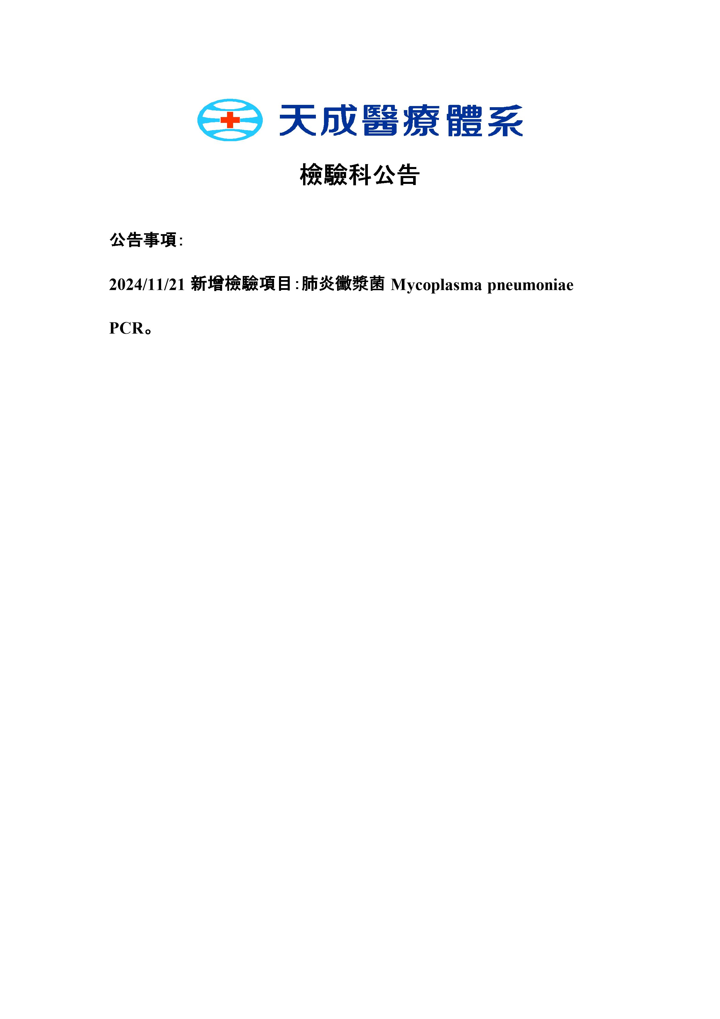 【新增公告】新增Mycoplasma pneumoniae PCR檢驗項目_20241121
