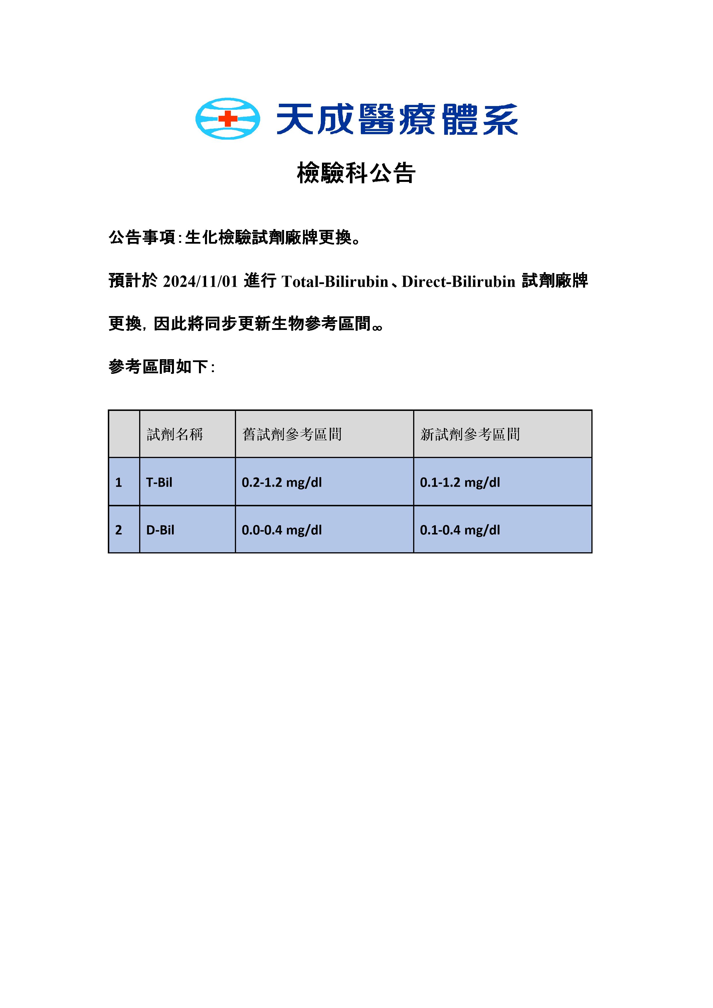 【異動公告】生化試劑Total-Bilirubin、Direct-Bilirubin更換公告_20241101